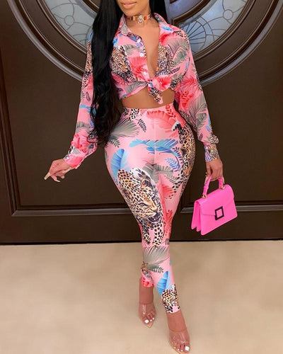 Cheetah Print Long Sleeve Skinny Button-down Blouse Suit Sets